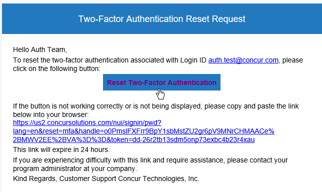 - User-initiated 2FA reset cannot be completed in Concur Mobile. You must reset 2FA by signing in to concursolutions.com via a web browser.